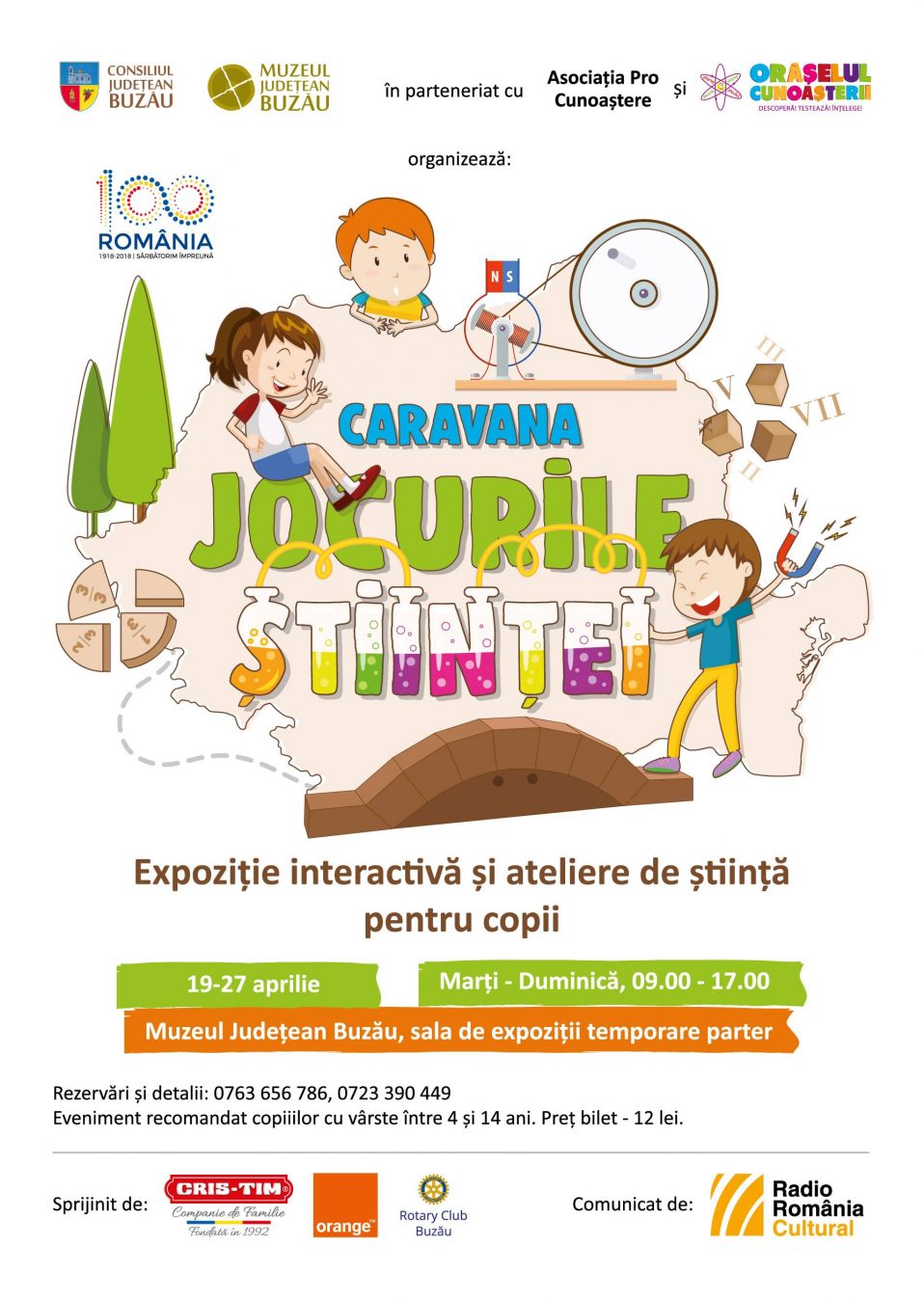 Copiii și profesorii sunt invitați să interacționeze altfel cu știința în cadrul Caravanei Jocurile Științei, o expoziție interactivă intinerantă, care se va desfășura la Muzeul Județean Buzău, în perioada 19 – 27 aprilie 2018, în sala de expoziții temporare.