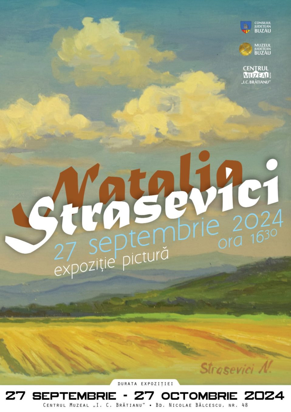 Muzeul Județean Buzău, instituție de cultură, artă și cercetare, ce funcționează sub autoritatea Consiliului Județean Buzău, anunță deschiderea unei expoziții temporare de pictură la Centrul Muzeal „I. C. Brătianu”. Lucrările de artă, semnate de Natalia Strasevici, pot fi admirate  în perioada 27 septembrie – 27 octombrie 2024, de marți până duminică, în intervalul orar 10:00 – 18:00.