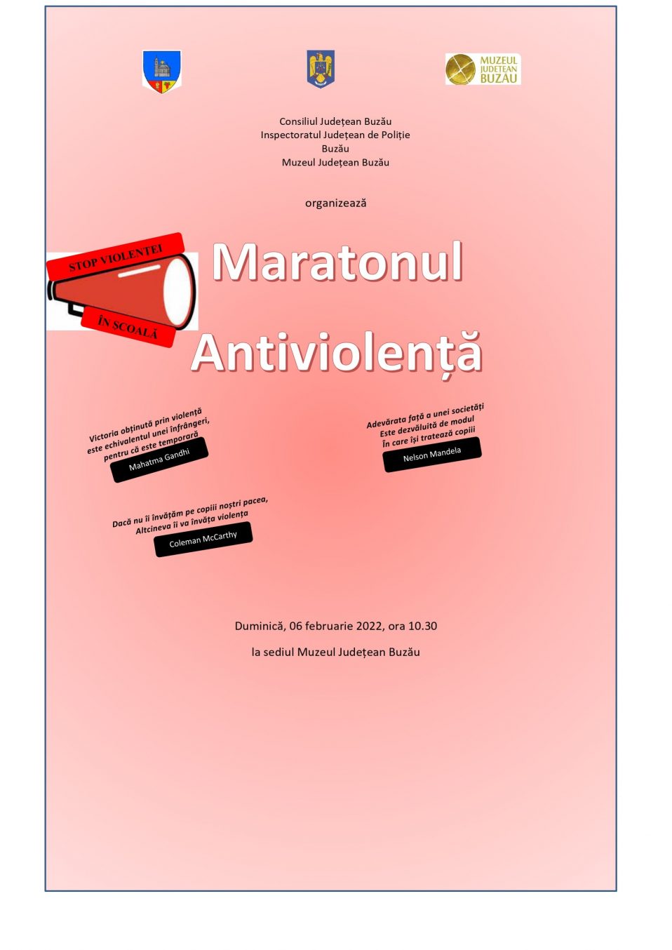 În acest sens Muzeul Județean Buzău va fi gazda unei acțiuni cu caracter preventiv organizată de Inspectoratul Județean de Poliție Buzău – Biroul Siguranța Școlară, duminică, 6 februarie 2022 începând cu ora 10:30. Activitatea se va desfășura la sediul central al instituției (Muzeul de Arheologie, Istorie și Artă).