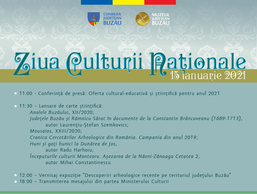 Muzeul Județean Buzău, instituție de cultură și cercetare ce funcționează sub autoritatea Consiliului Județean Buzău, cu sediul în mun. Buzău, Aleea Castanilor, nr. 1, jud. Buzău, reprezentat legal de către dr. Daniel Costache în calitate de Manager, anunță organizarea unui ansamblu de activități culturale dedicate Zilei Culturii Naționale. Cu acest prilej va fi lansată și Oferta culturală, educativă și științifică a muzeului pentru anul 2021.