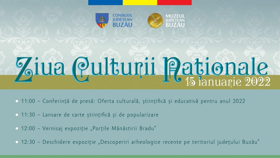 Muzeul Județean Buzău, instituție de cultură și cercetare ce funcționează sub autoritatea Consiliului Județean Buzău, cu sediul în mun. Buzău, Aleea Castanilor, nr. 1, jud. Buzău, organizează, sâmbătă, 15 ianuarie, un ansamblu de activități culturale dedicate Zilei Culturii Naționale. Programul cuprinde conferința de presă anuală, lansare de carte și două vernisaje.