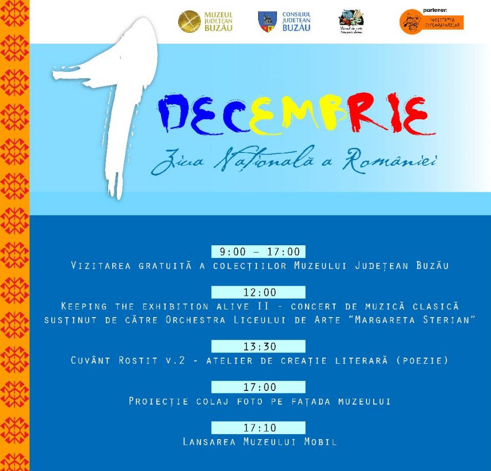 Muzeul Județean Buzău, instituție de cultură și cercetare ce funcționează sub autoritatea Consiliului Județean Buzău, cu sediul în mun. Buzău, Aleea Castanilor, nr. 1, jud. Buzău, reprezentat legal de către dr. Daniel Costache în calitate de Manager, anunță organizarea unei serii de evenimente culturale și educative, prilejuite de Ziua Națională a României, ce se vor desfășura conform următorului program: